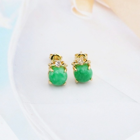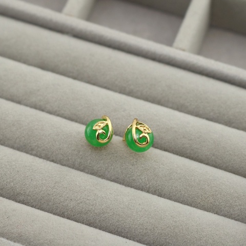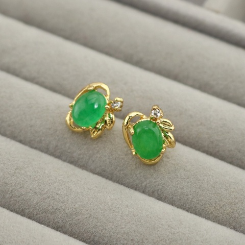 EYL1026 Delicate Vintage Style Green Jade Stud Earrings, Aesthetic Gold Plated Fine Natural Jadeite Earring
