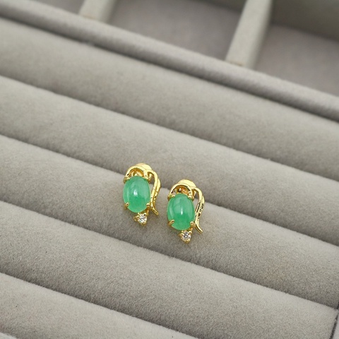 EYL1027 Art Style Geometric Earring Gold Plated Zircon Oval Green Jade Stud Earrings, Women Jewelry Elegant Ear Pieces