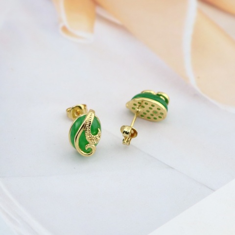 EYL1030 Unique 18K Gold Plated CZ Diamond Leaf Design Green Oval Jade Stud Earrings, Real Jadeite Wholesale Exquisite Studs