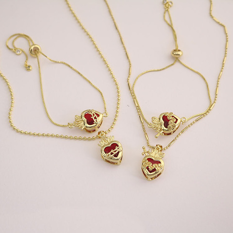 S11472 Chic 18K chapado en oro cristal rojo CZ pavé corazón asustado con daga encanto cadena pulsera collar conjuntos de joyas para boda