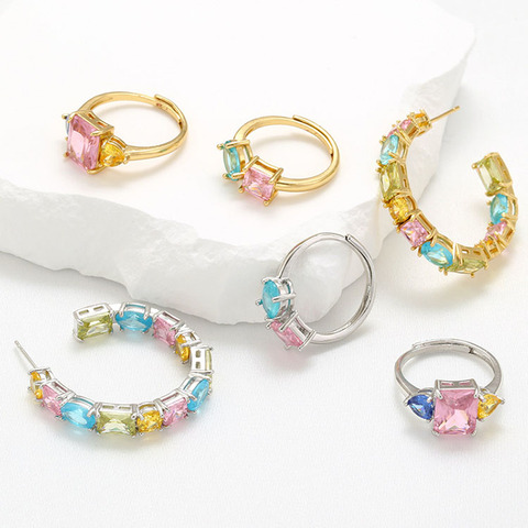 Conjunto de pendientes y anillo de zirconia cúbica, Set de pendientes y anillo de zirconia cúbica de colores Pastel, chapado en oro de 18k, delicado, S11159
