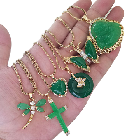 Yeşil yeşim takı paslanmaz çelik hip hop halat zincir donut kelebek kalp yusufçuk çapraz kolye yeşim kolye