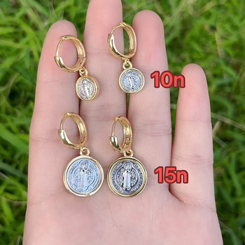 Em1428 18K vàng và bạc mạ hai giai điệu ST Benedict huy chương dangle Hoop Bông tai đồng xu vàng Huggies tôn giáo đồ trang sức tinh thần